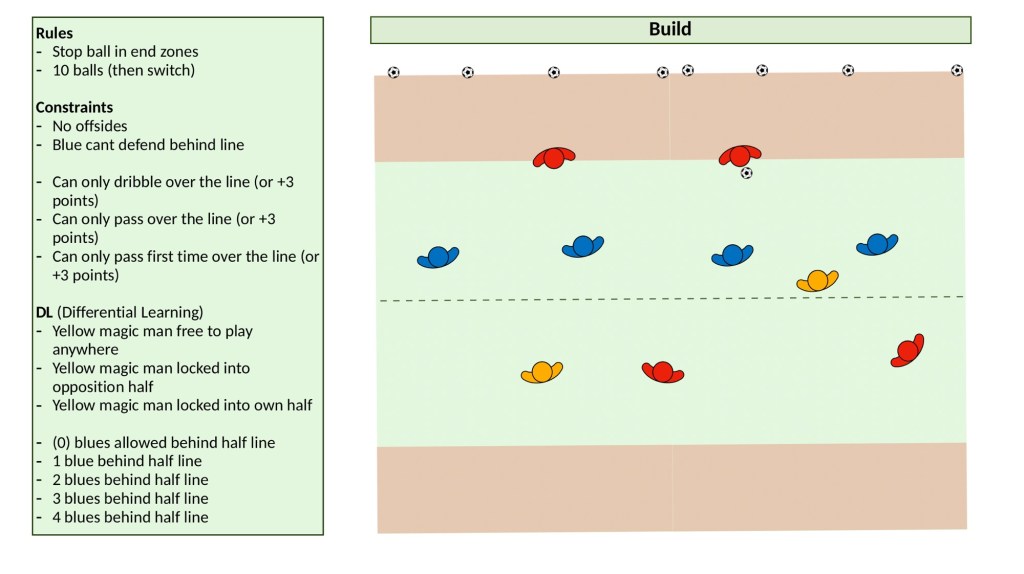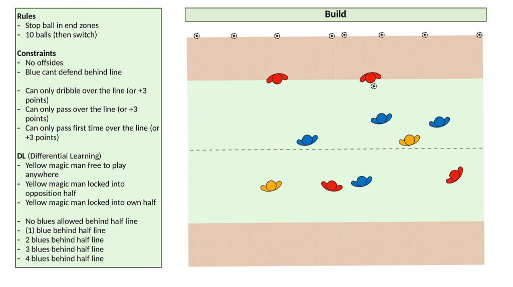 This is a keystone in constraints based coaching, constraining to afford. Essentially constraining the defenders so they act in a specific way, and therefore your attackers will act against that. As you scroll through the practice designs, new rules are applied; now one defender must defend behind the halfway line, then two, then three and so on.