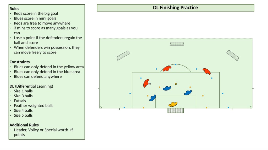 So what does a team based DL practice look like? Let’s look at finishing. Traditionally, finishing practices contain very little variation. Below is a finishing practice designed to add tonnes of stochastic resonance/noise/variation. You can adapt the rules of the practice as you see fit for your players. You adapt this practice easily to incorporate more or less players.